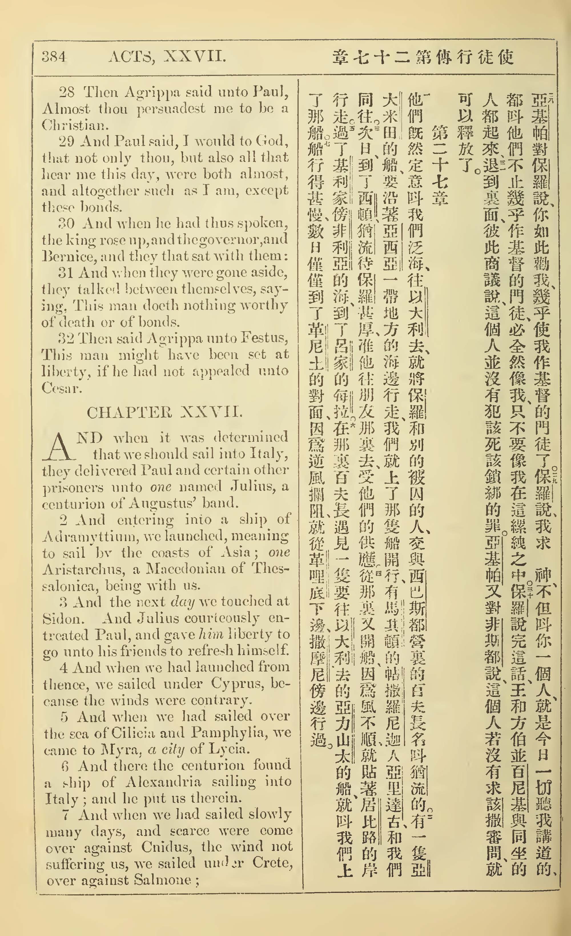 1902年新约全书(中英对照) 使徒行传 26 章 28 节到 27 章 7 节