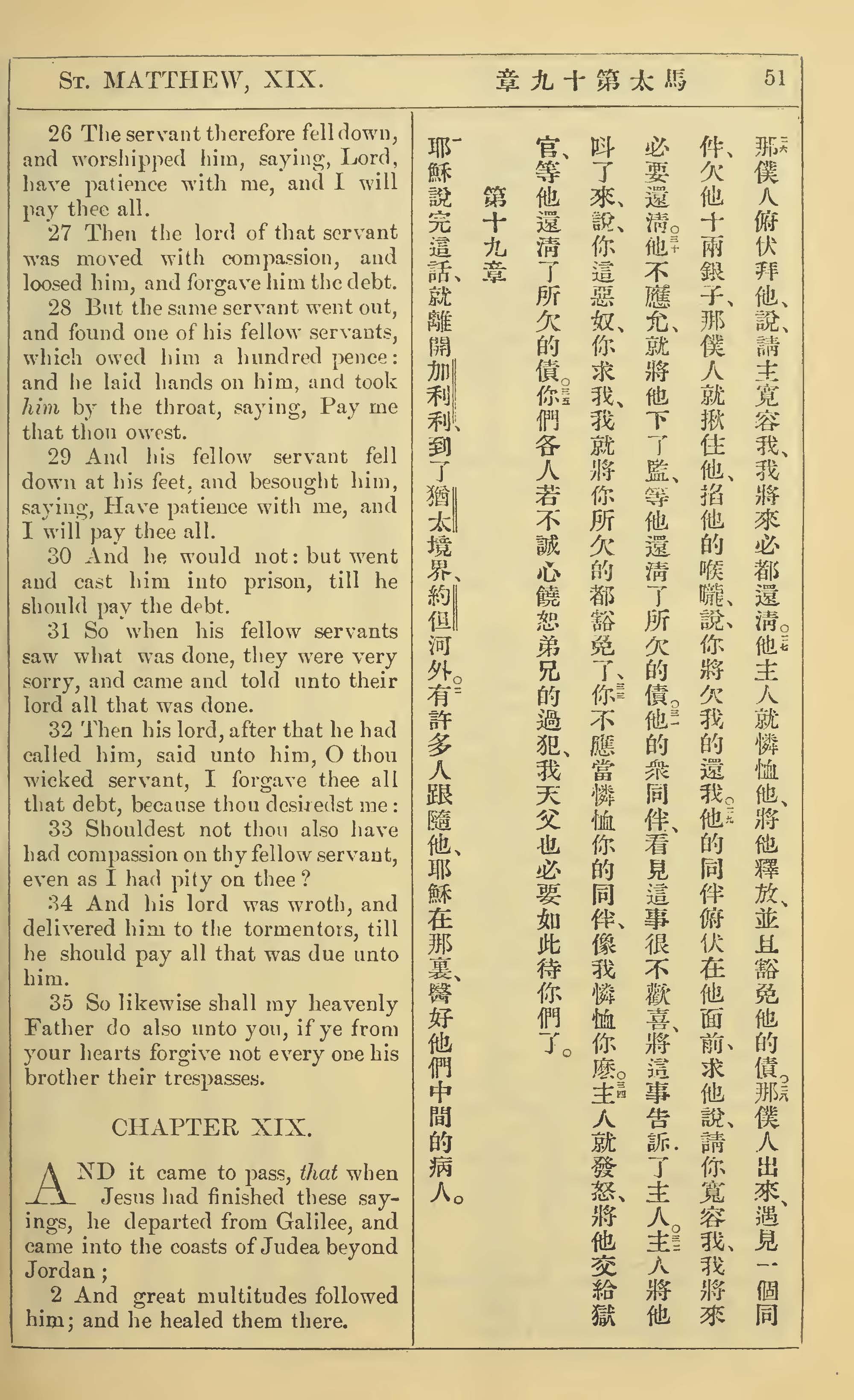 1902年新约全书(中英对照) 马太福音 18 章 26 节到 19 章 2 节