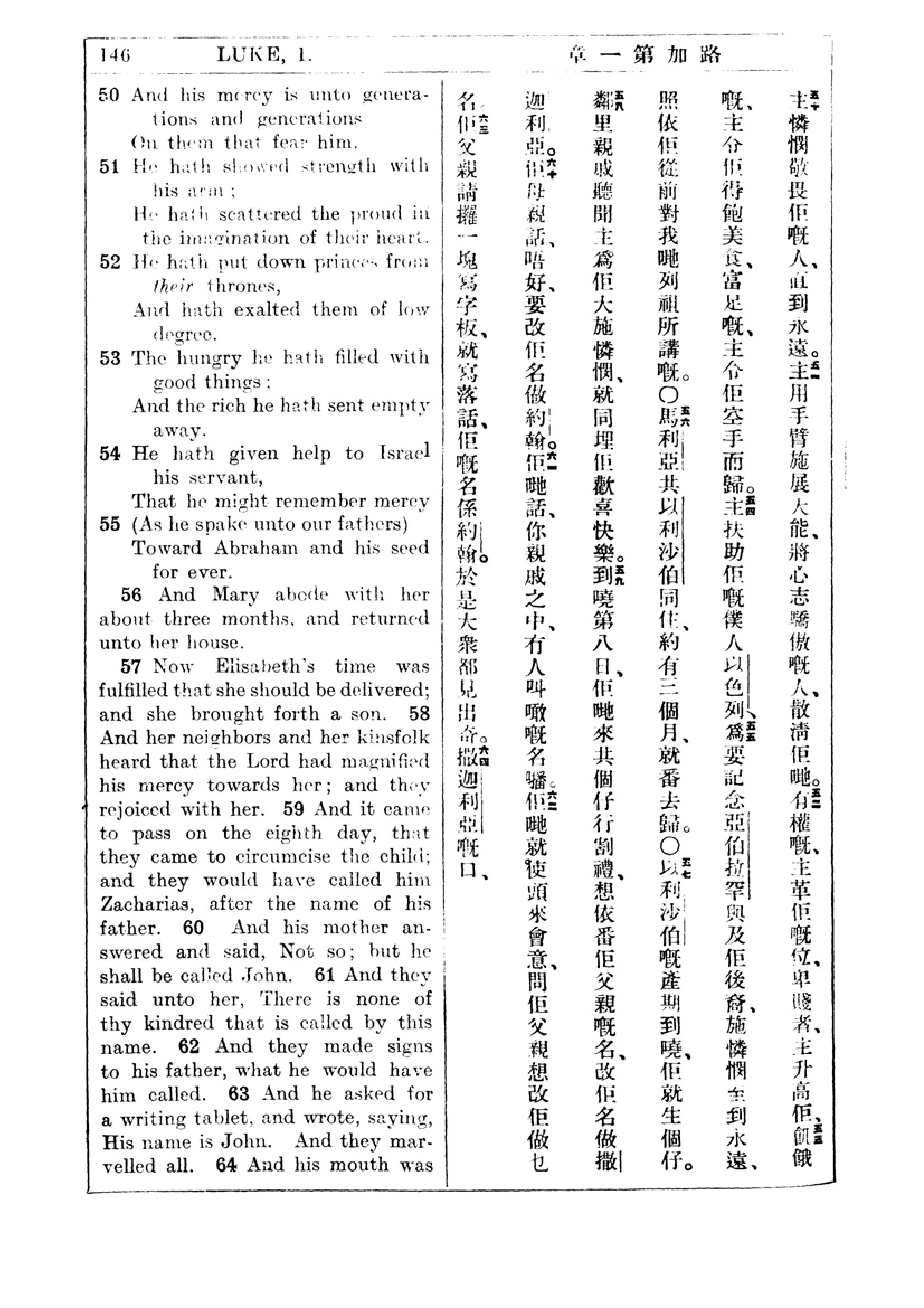 1927年新约全书(中英对照) 路加福音 1 章 50 节到 1 章 64 节
