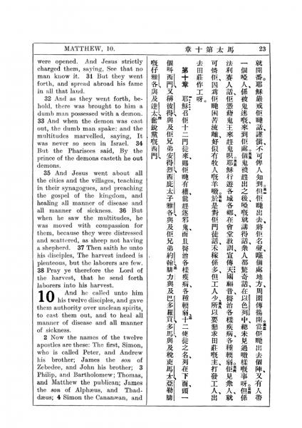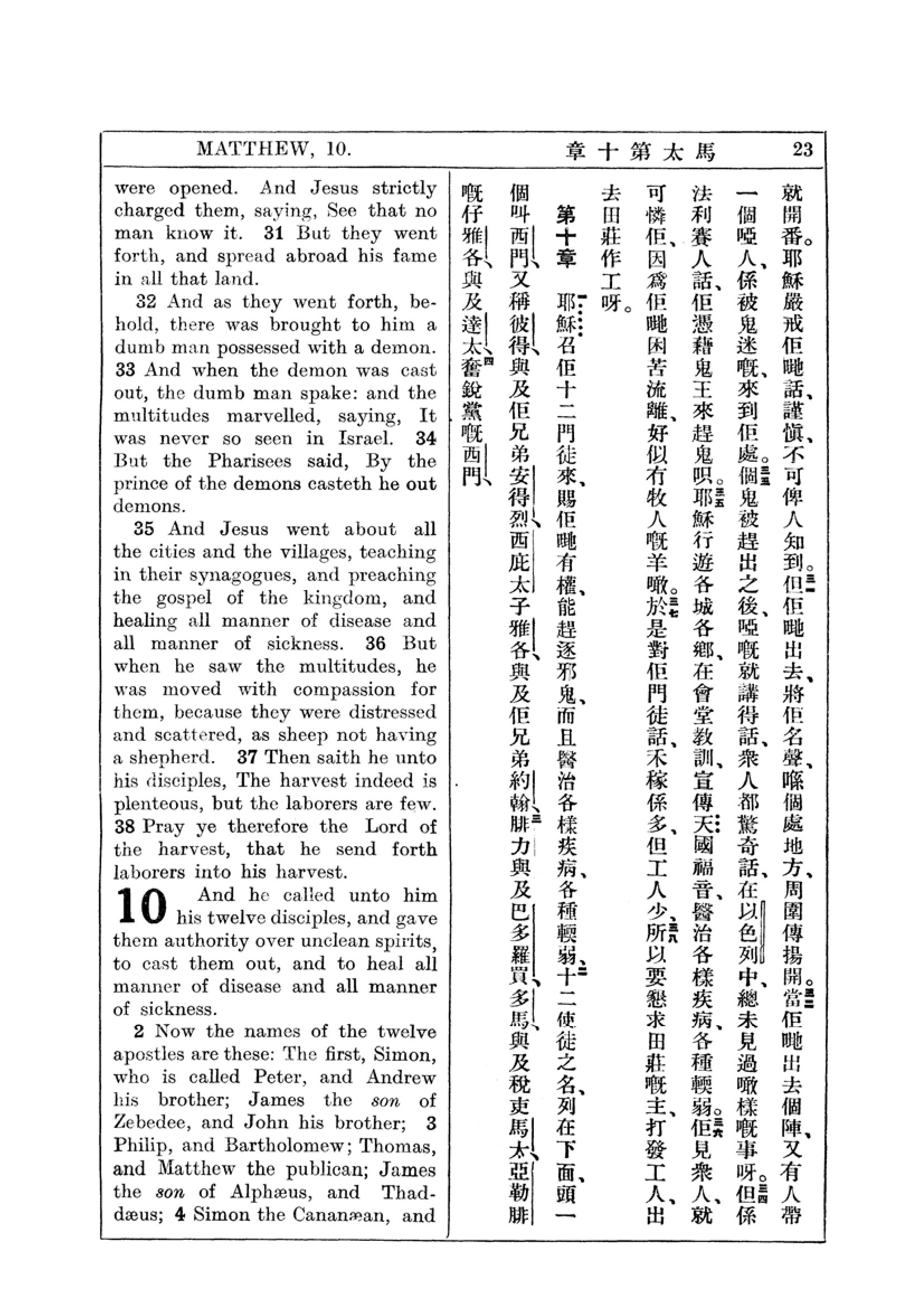 1927年新约全书(中英对照) 马太福音 9 章 30 节到 10 章 4 节