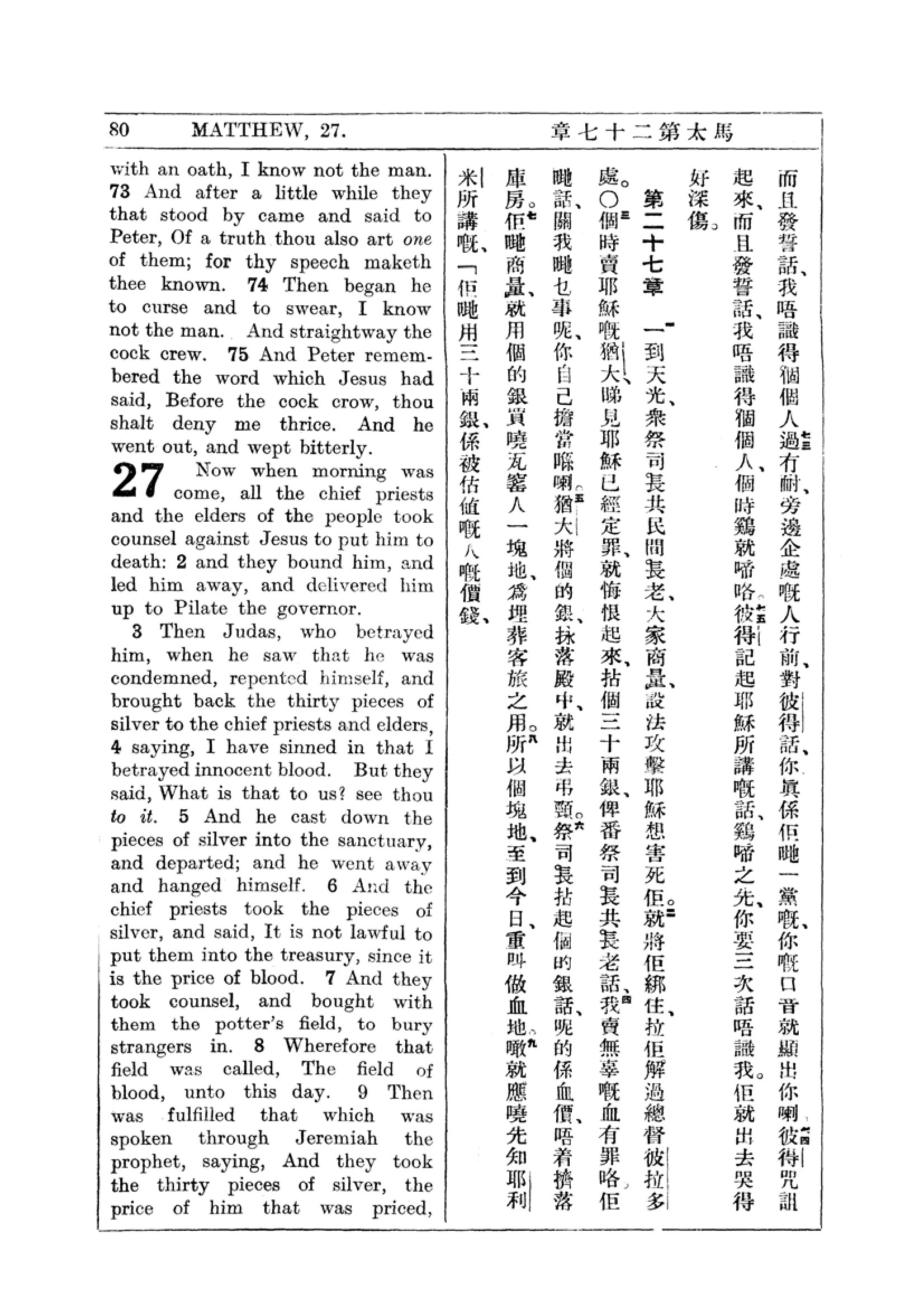 1927年新约全书(中英对照) 马太福音 26 章 73 节到 27 章 9 节