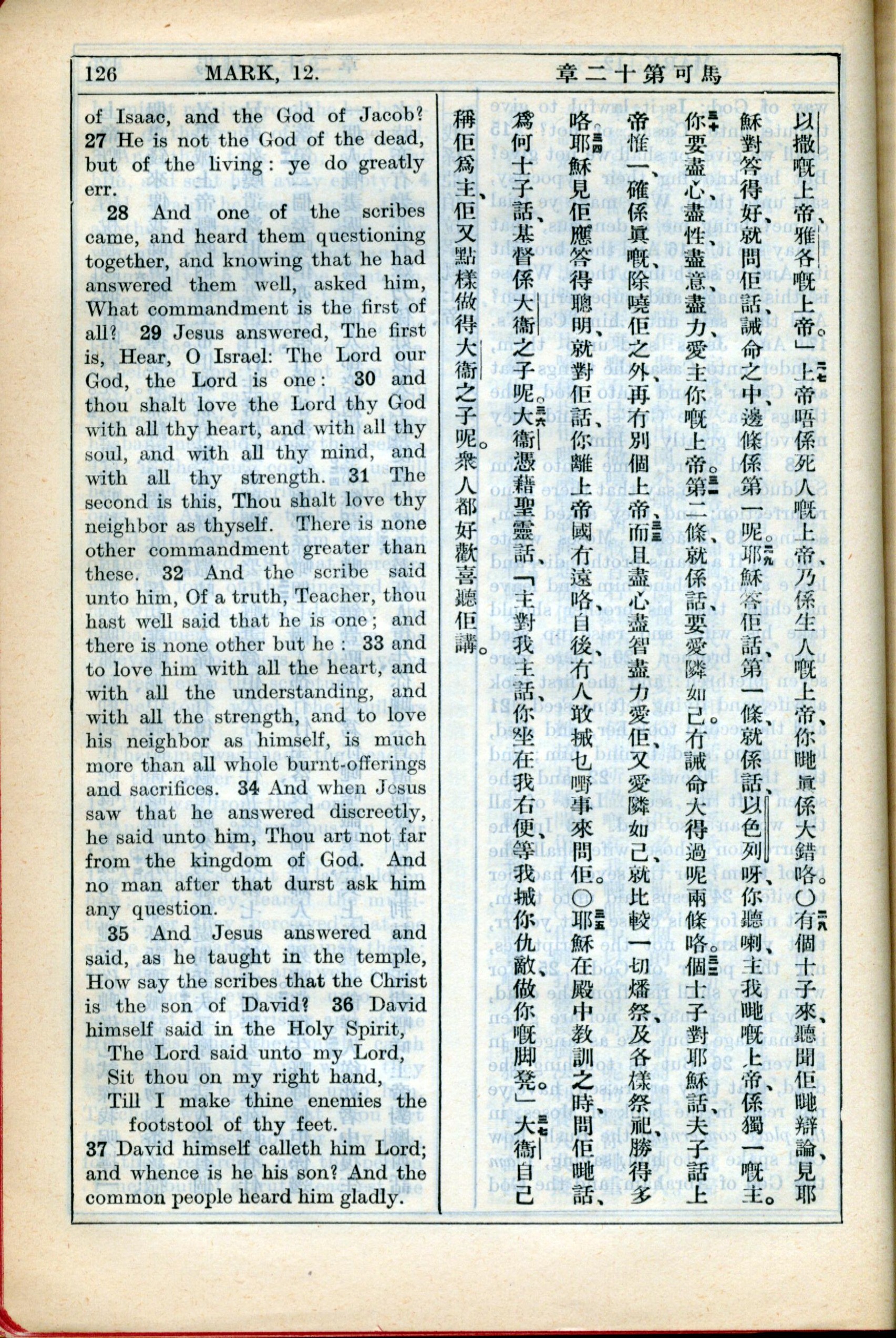 1931年新约全书广东话新译本与美国新译英文 马可福音 12 章 27 节到 12 章 37 节
