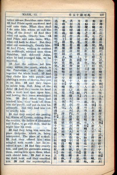 1931年新约全书广东话新译本与美国新译英文 马可福音 15 章 12 节到 15 章 26 节