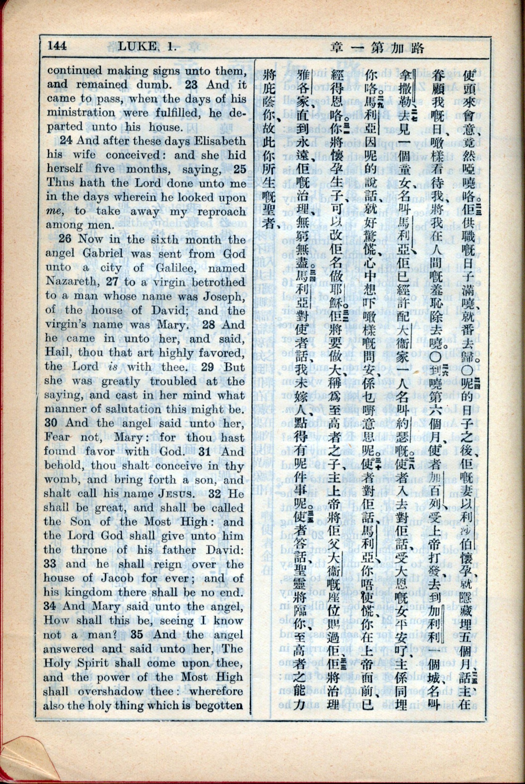 1931年新约全书广东话新译本与美国新译英文 路加福音 1 章 23 节到 1 章 35 节