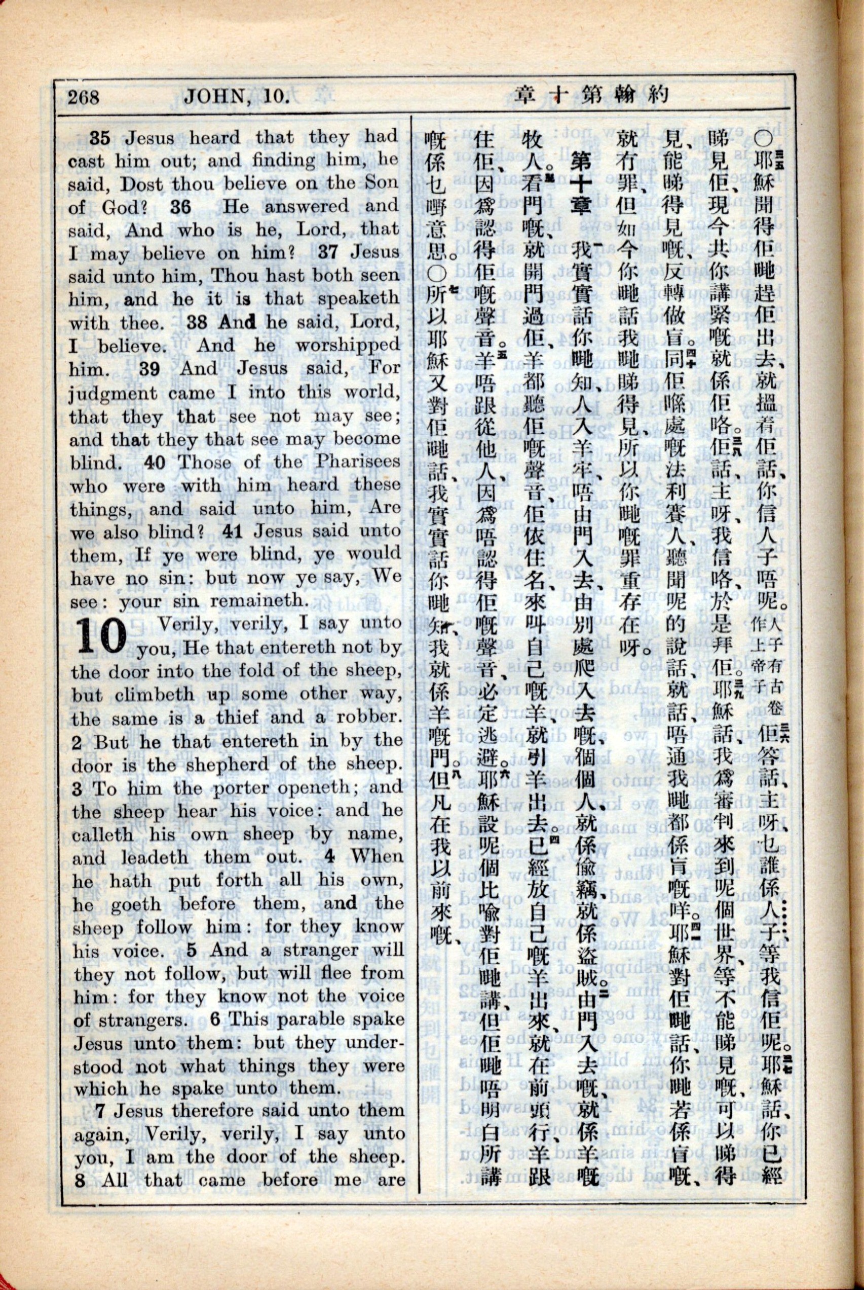 1931年新约全书广东话新译本与美国新译英文 约翰福音 9 章 35 节到 10 章 8 节