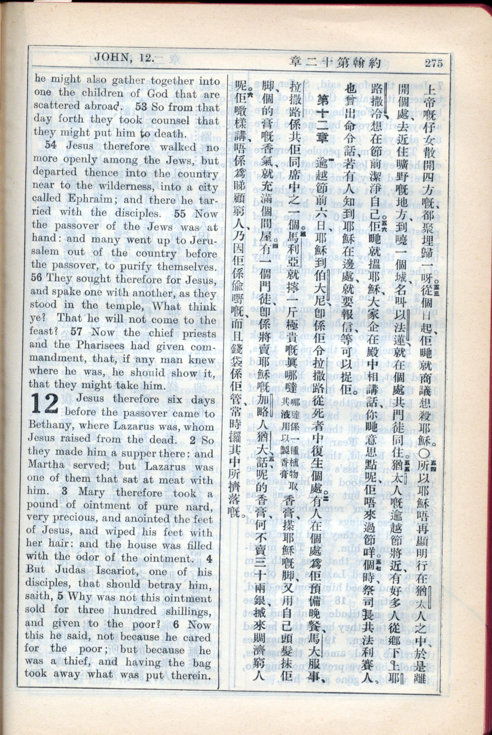 1931年新约全书广东话新译本与美国新译英文 约翰福音 11 章 53 节到 12 章 6 节