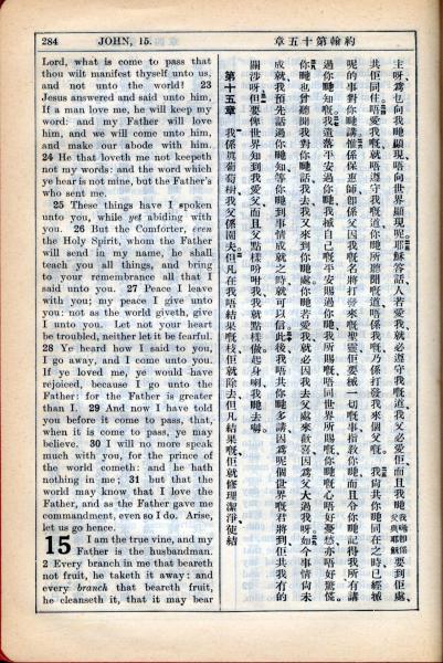 1931年新约全书广东话新译本与美国新译英文 约翰福音 14 章 23 节到 15 章 2 节