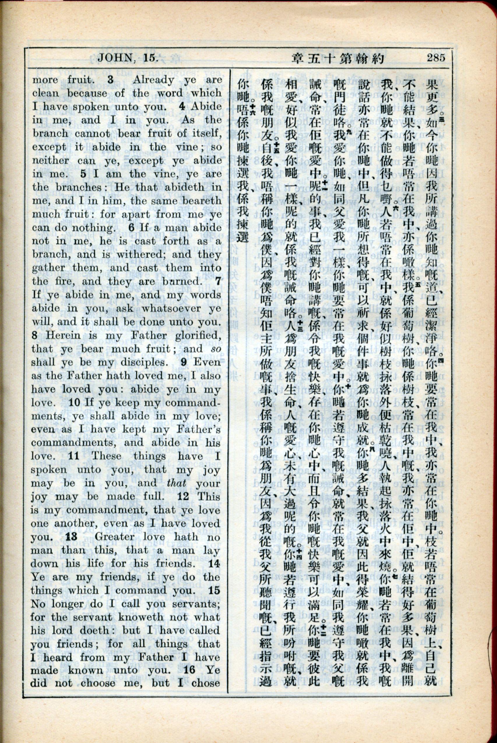 1931年新约全书广东话新译本与美国新译英文 约翰福音 15 章 3 节到 15 章 15 节