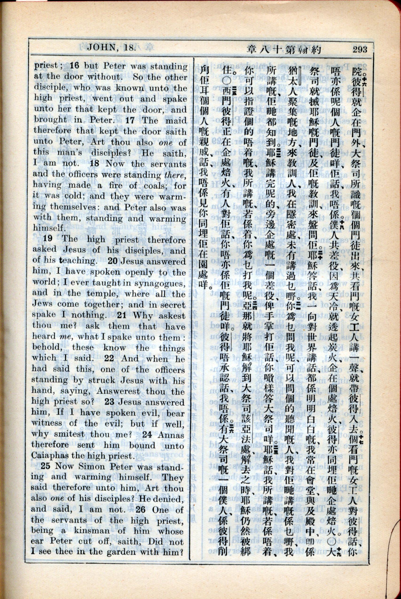 1931年新约全书广东话新译本与美国新译英文 约翰福音 18 章 16 节到 18 章 26 节