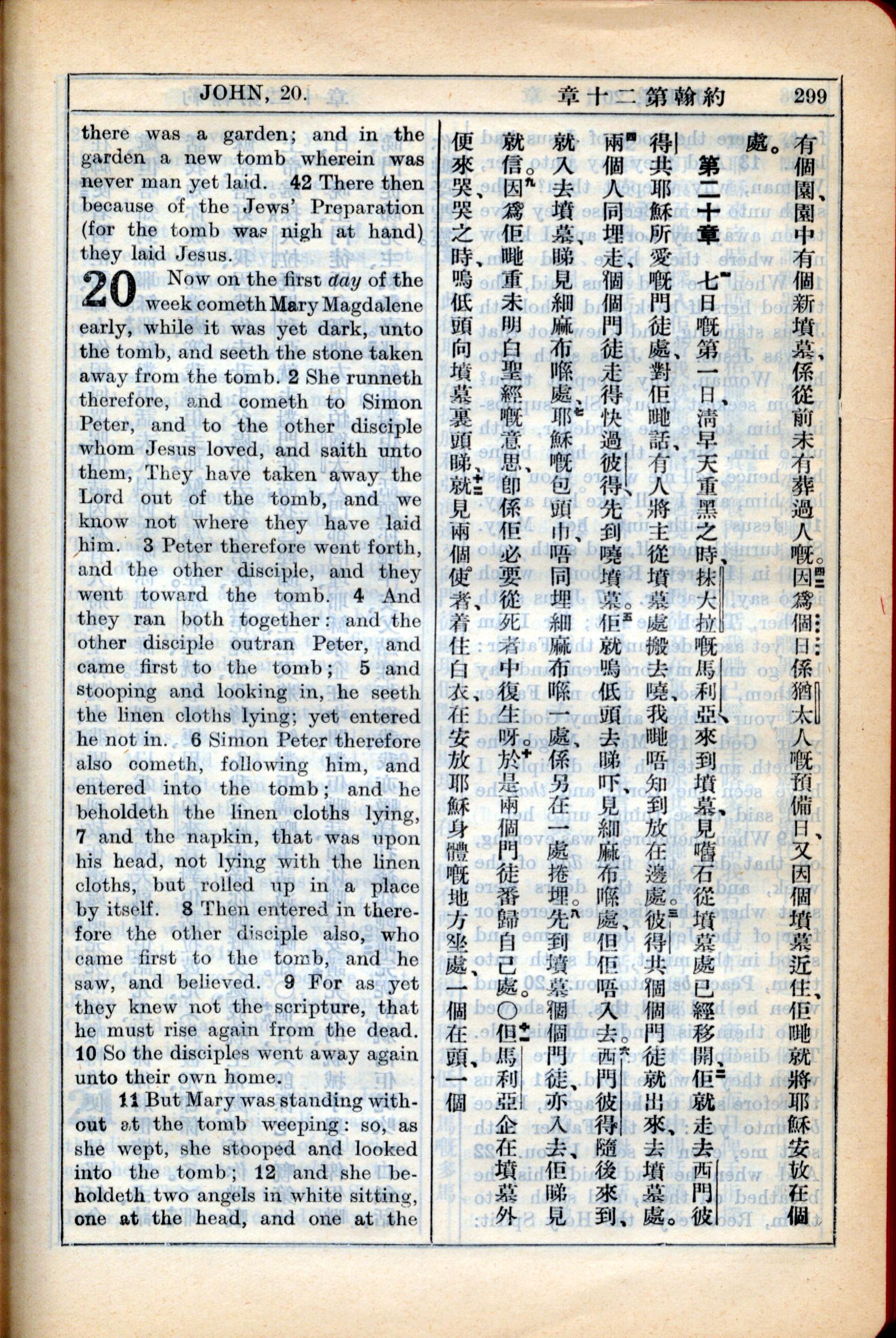 1931年新约全书广东话新译本与美国新译英文 约翰福音 19 章 42 节到 20 章 12 节