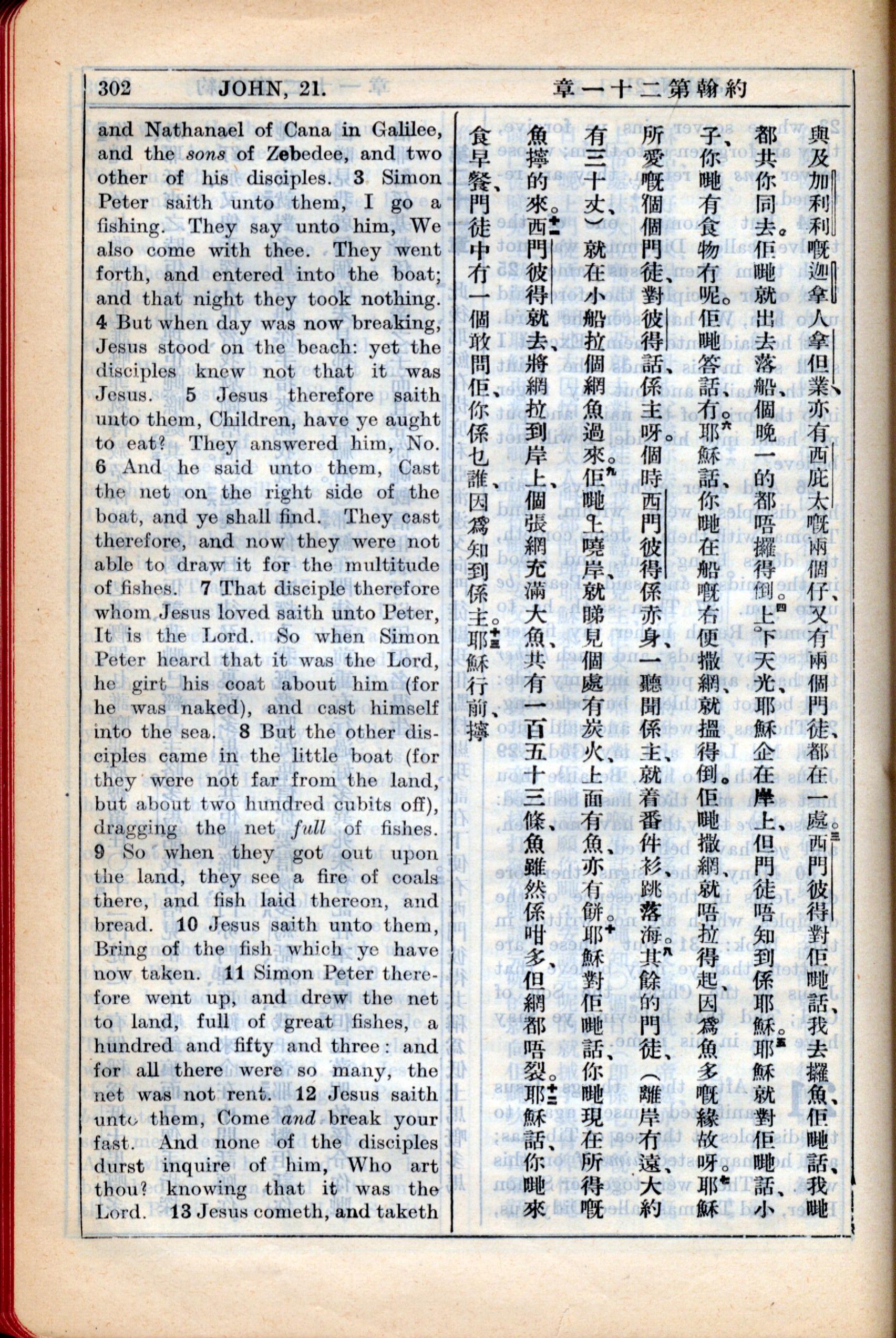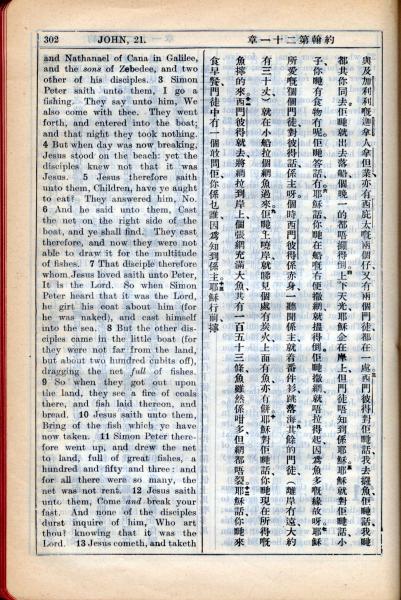 1931年新约全书广东话新译本与美国新译英文 约翰福音 21 章 3 节到 21 章 13 节