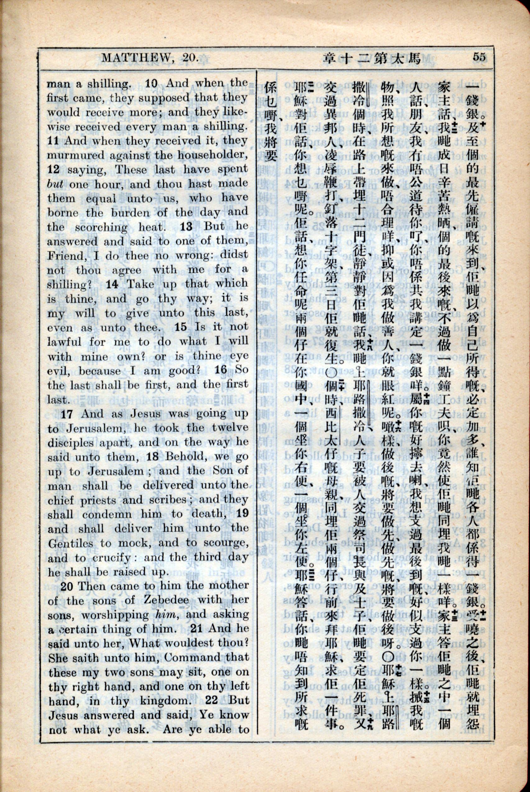 1931年新约全书广东话新译本与美国新译英文 马太福音 20 章 10 节到 20 章 22 节