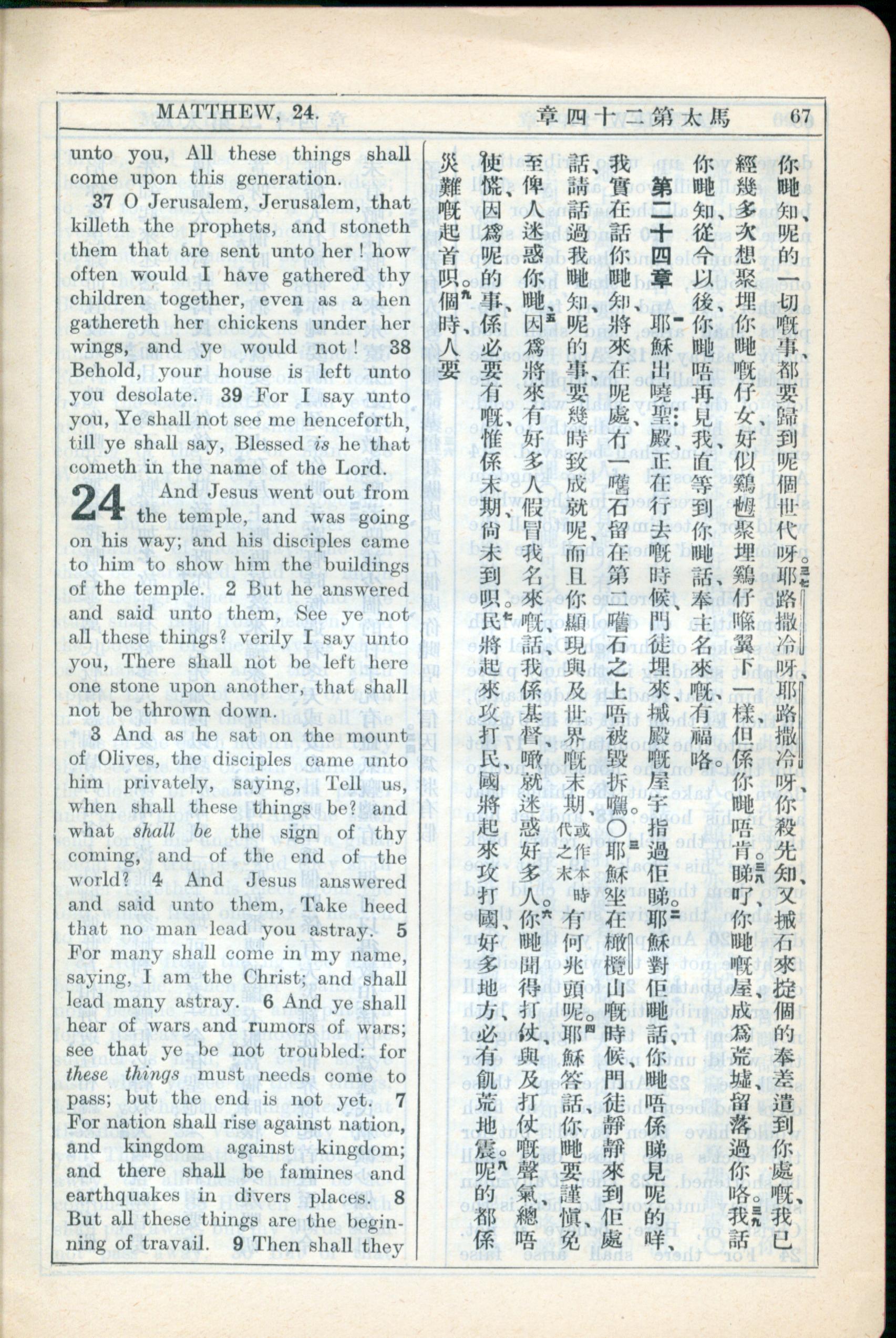 1931年新约全书广东话新译本与美国新译英文 马太福音 23 章 36 节到 24 章 8 节