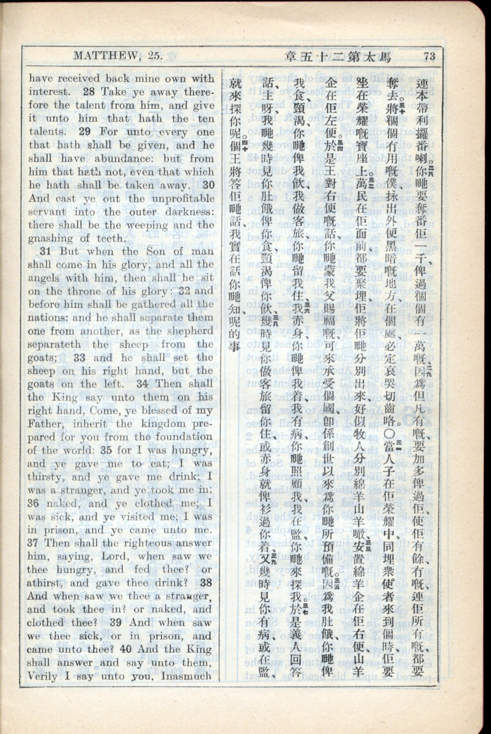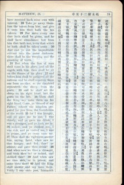 1931年新约全书广东话新译本与美国新译英文 马太福音 25 章 28 节到 25 章 40 节