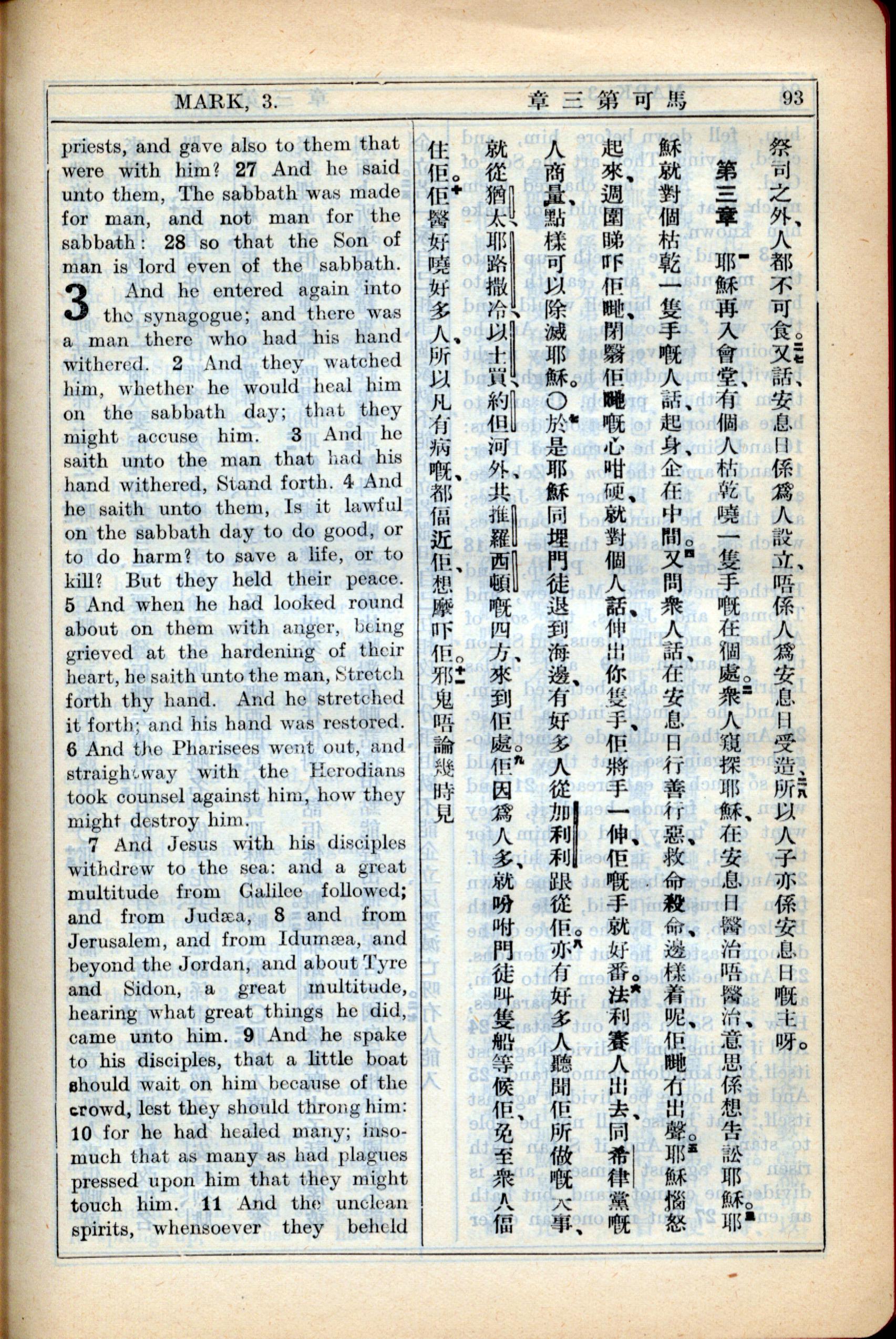 1931年新约全书广东话新译本与美国新译英文 马可福音 2 章 27 节到 3 章 11 节