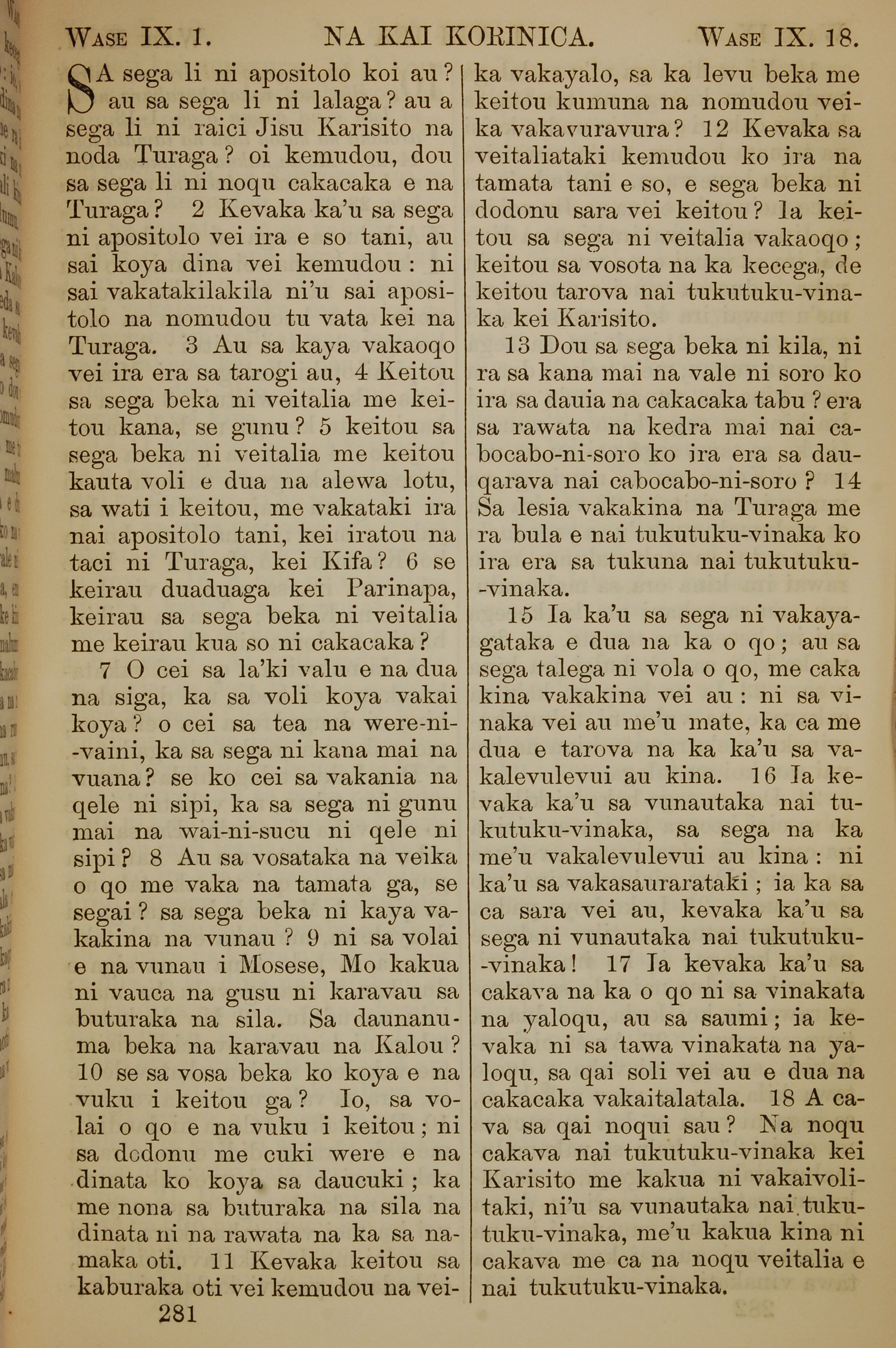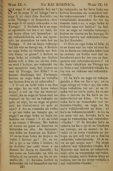 1858年斐濟文新約全書 哥林多前書 9 章 1 節到 9 章 18 節