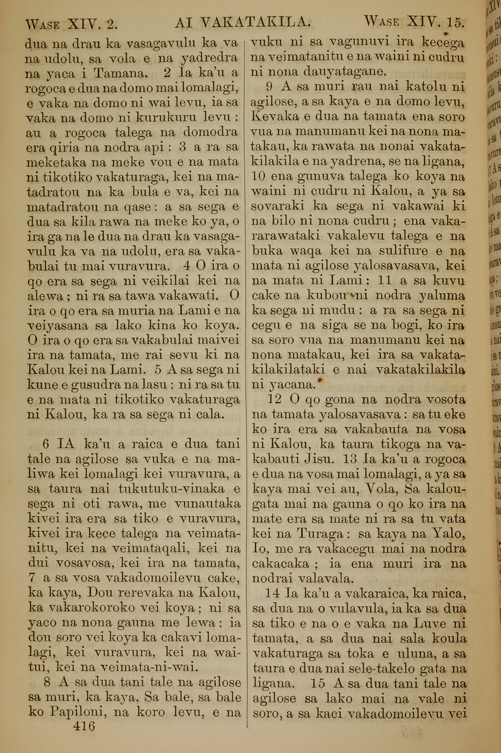 1858年斐濟文新約全書 啟示錄 14 章 2 節到 14 章 15 節
