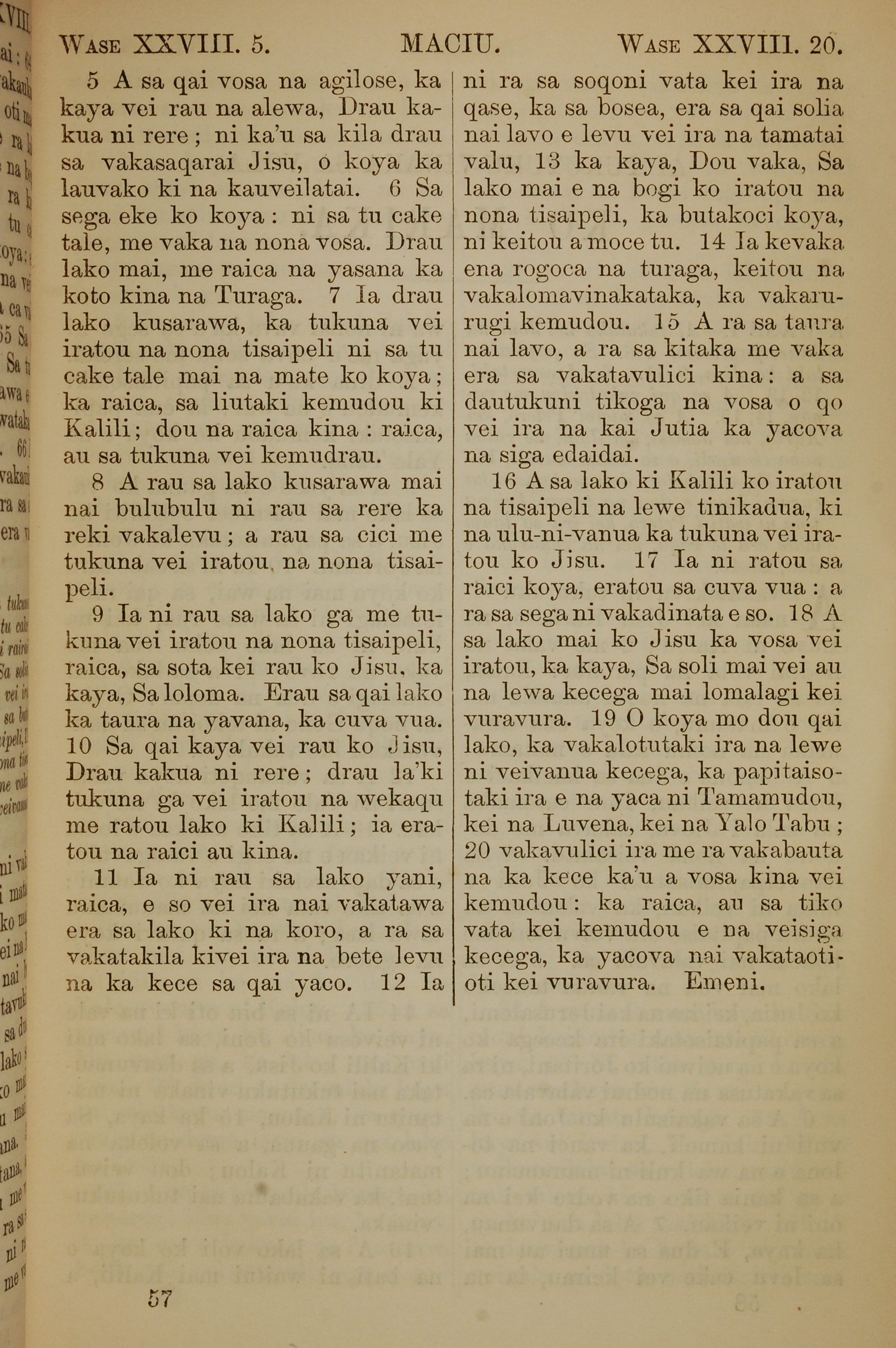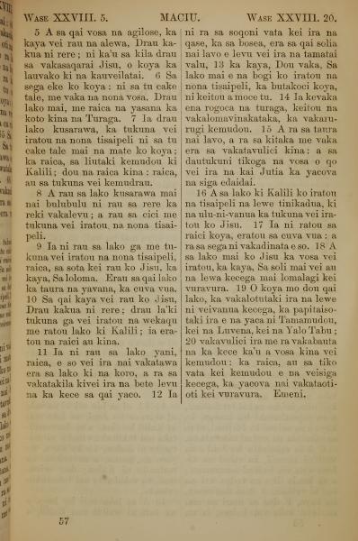 1858年斐濟文新約全書 馬太福音 28 章 5 節到 28 章 20 節