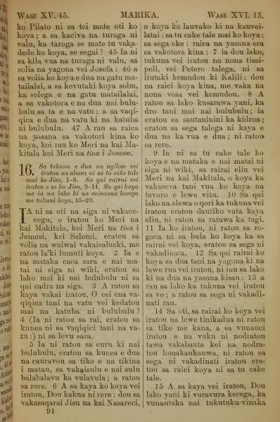1858年斐濟文新約全書 馬可福音 15 章 44 節到 16 章 15 節